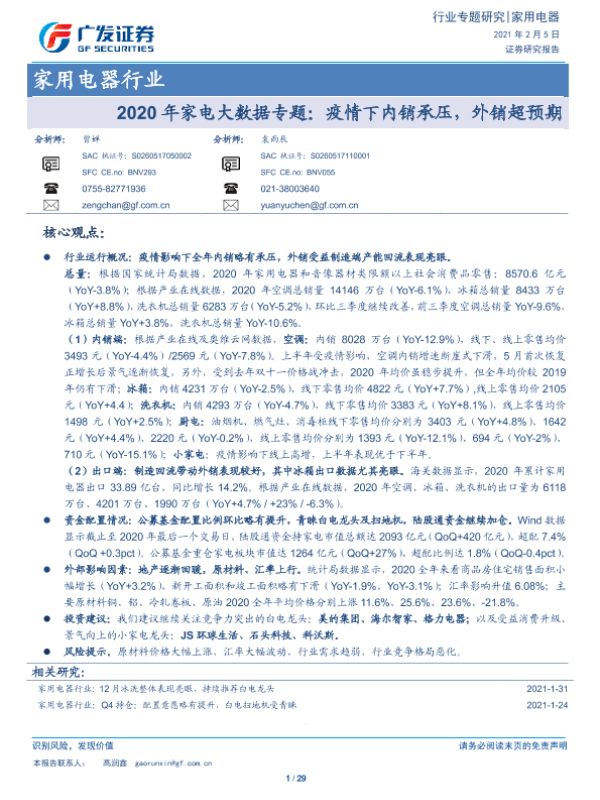 【广发证券】【20210205】2020年家电大数据专题:疫情下内销承压,外销超预期-29页 行业研究