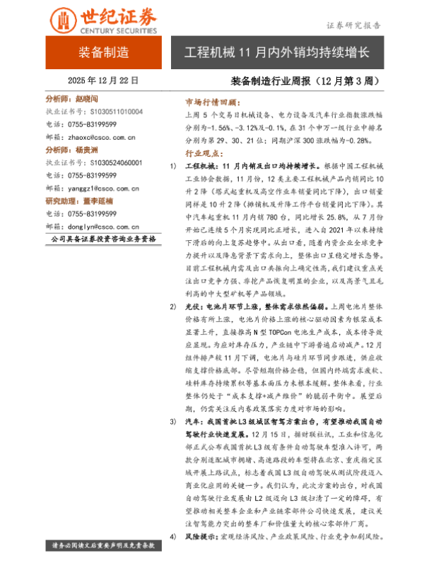 【世纪证券】【202512】工程机械 11月内外销均持续增长-9页 证券期货研究报告