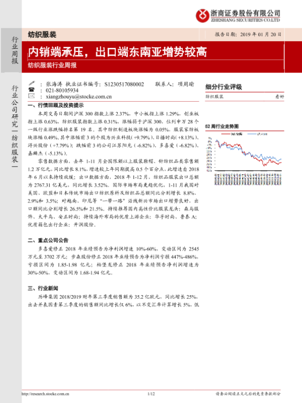 【浙商证券】【20190120】20190120-浙商证券-纺织服装行业周:内销端承压,出口端东南亚增势较高-12页 行业研究