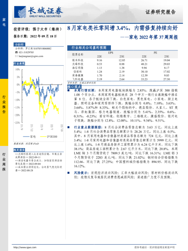 【长城证券】【20220918】家电2022年第37周周报:8月家电类社零同增3.4%,内需修复持续向好-26页 行业研究