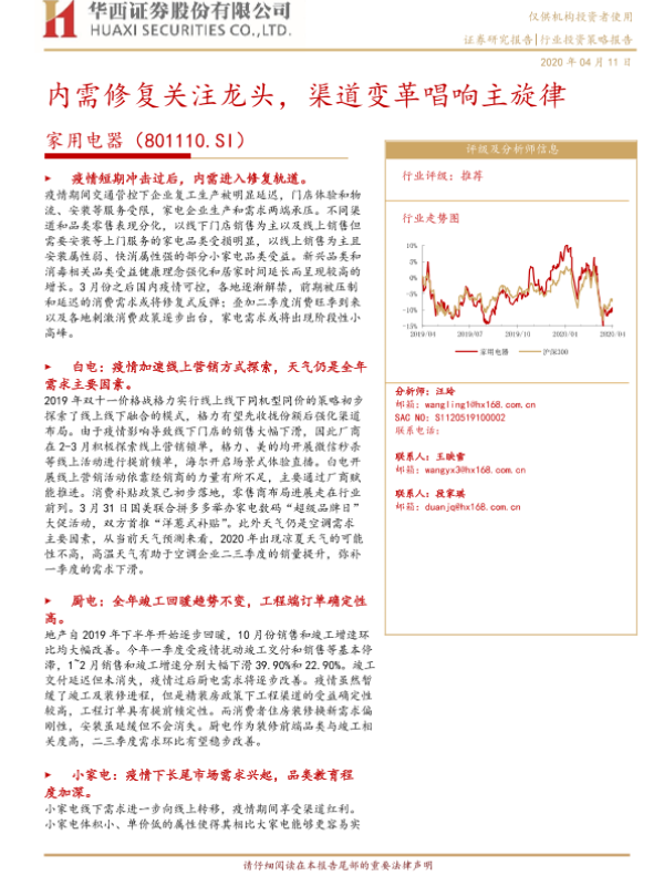 【华西证券】【20200411】家用电器行业投资策略报告:内需修复关注龙头,渠道变革唱响主旋律-17页 行业研究