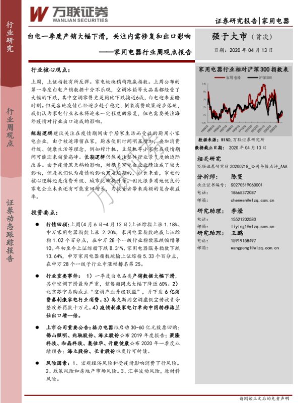 【万联证券】【20200413】20200413-万联证券-家用电器行业周观点报告:白电一季度产销大幅下滑,关注内需修复和出口影响-11页 行业研究