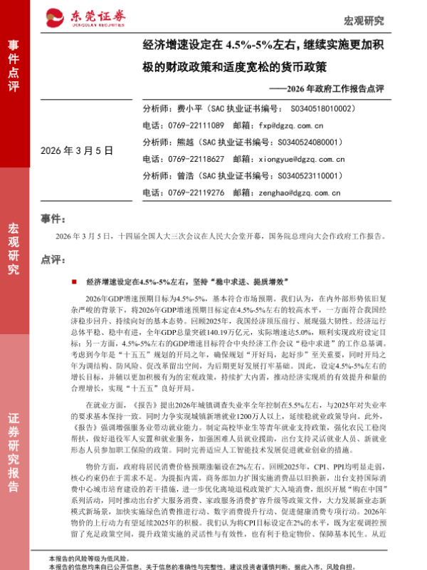 【东莞证券】【202603】2026年政府工作报告点评:经济增速设定在4.5%-5%左右,继续实施更加积极的财政政策和适度宽松的货币政策-7页 证券期货研究报告