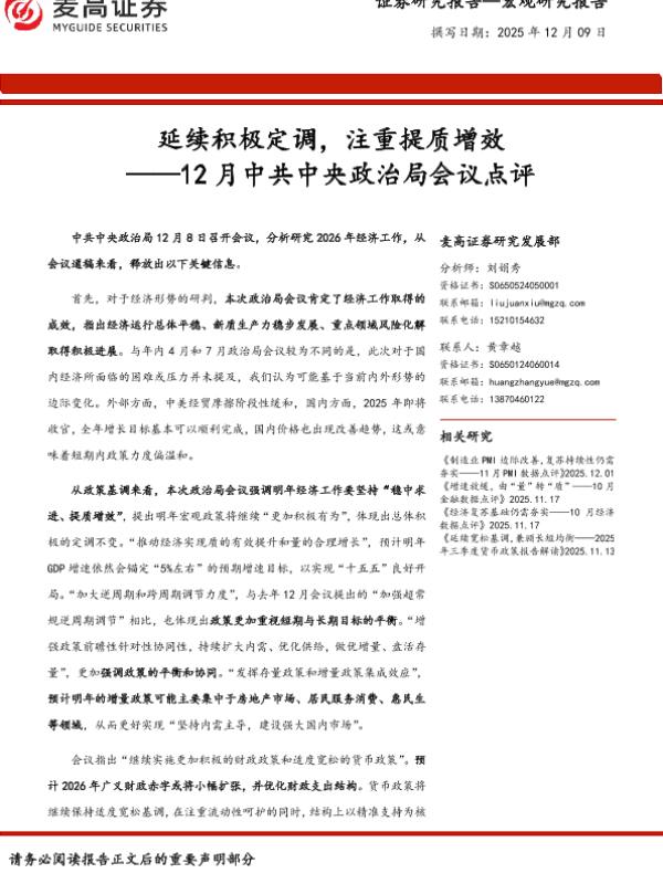 【麦高证券】【202512】延续积极定调,注重提质增效——12月中共中央政治局会议点评-5页 证券期货研究报告