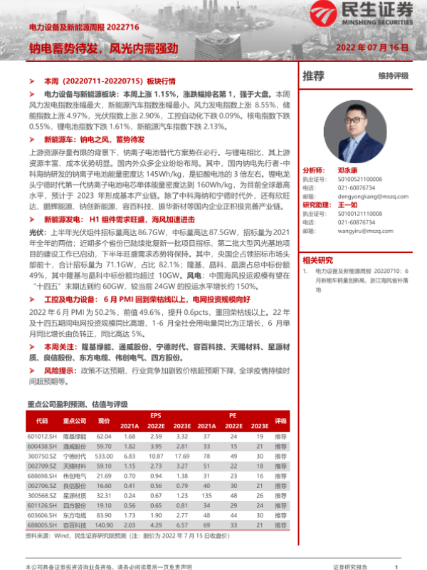 【民生证券】【20220716】电力设备及新能源周报:钠电蓄势待发,风光内需强劲-32页 行业研究