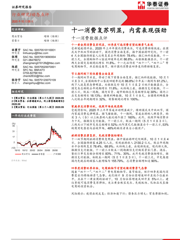 【华泰证券】【20201008】十一消费数据点评:十一消费复苏明显,内需表现强劲-4页 行业研究