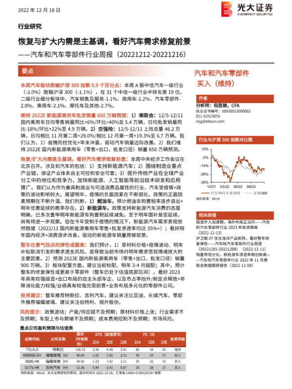 【光大证券】【20221218】汽车和汽车零部件行业周报:恢复与扩大内需是主基调,看好汽车需求修复前景-23页 行业研究