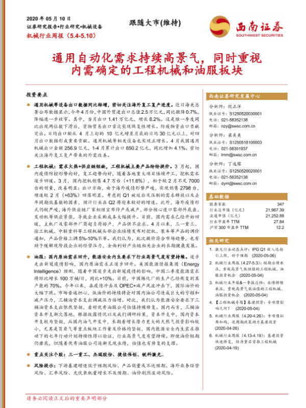 【西南证券】【20200510】20200510-西南证券-机械行业周报:通用自动化需求持续高景气,同时重视内需确定的工程机械和油服板块-15页 行业研究