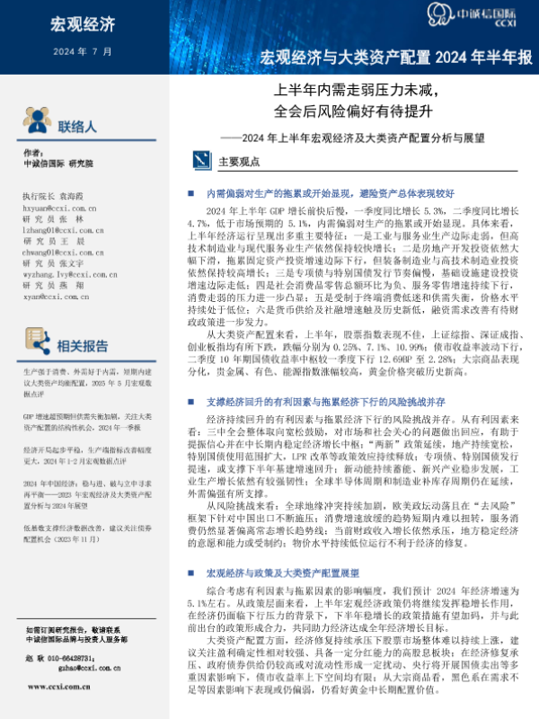 【中诚信国际】【20240731】2024年上半年宏观经济及大类资产配置分析与展望:上半年内需走弱压力未减,全会后风险偏好有待提升-21页 行业研究