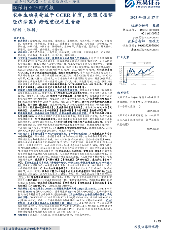 【东吴证券】【20250817】农林生物质受益于CCER扩容-欧盟《循环经济法案》渐近重视再生资源-29页 证券期货研究报告
