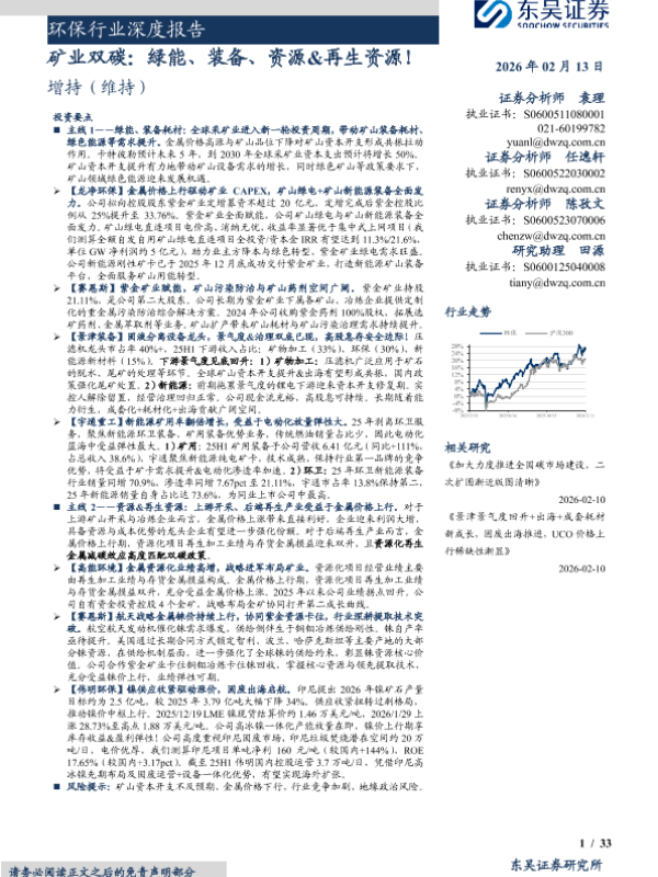 【东吴证券】【202602】环保行业深度报告:矿业双碳,绿能、装备、资源&再生资源!-33页 证券期货研究报告