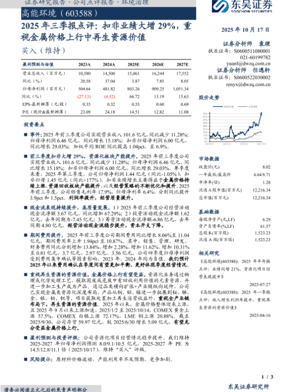 【东吴证券】【202510】2025年三季报点评:扣非业绩大增 29%,重视金属价格上行中再生资源价值-3页 证券期货研究报告