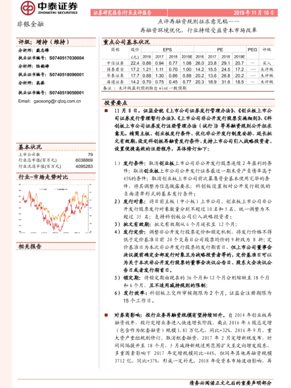 【中泰证券】【20191110】点评再融资规则征求意见稿:再融资环境优化,行业持续受益资本市场改革-8页 行业研究