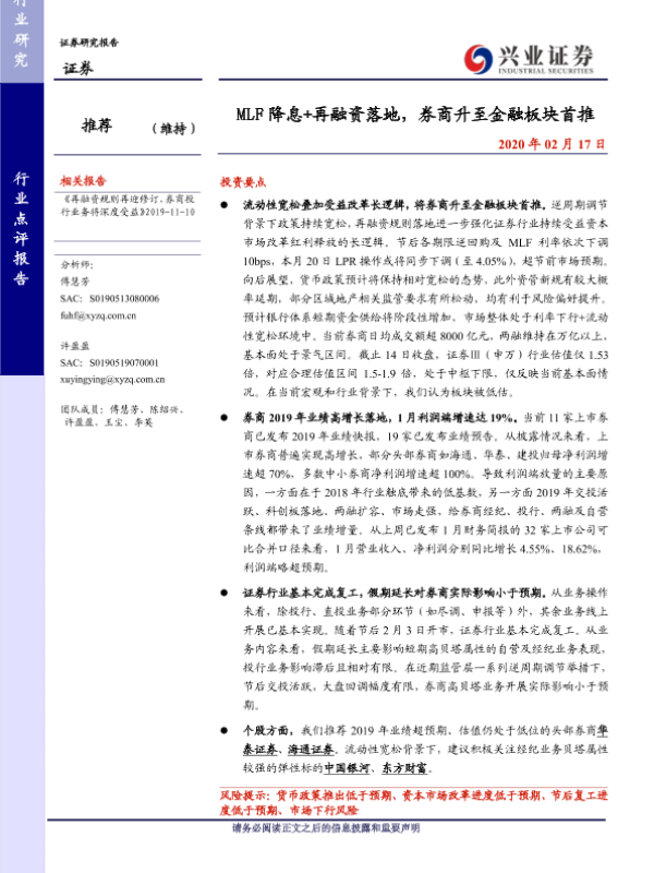 【兴业证券】【20200217】MLF降息+再融资落地,券商升至金融板块首推-4页 行业研究