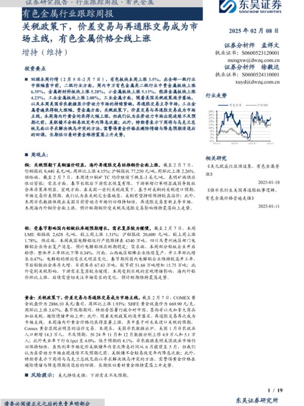 【东吴证券】【20250208】20250208-东吴证券-有色金属行业跟踪周报:关税政策下,价差交易与再通胀交易成为市场主线,有色金属价格全线上涨-19页 行业研究