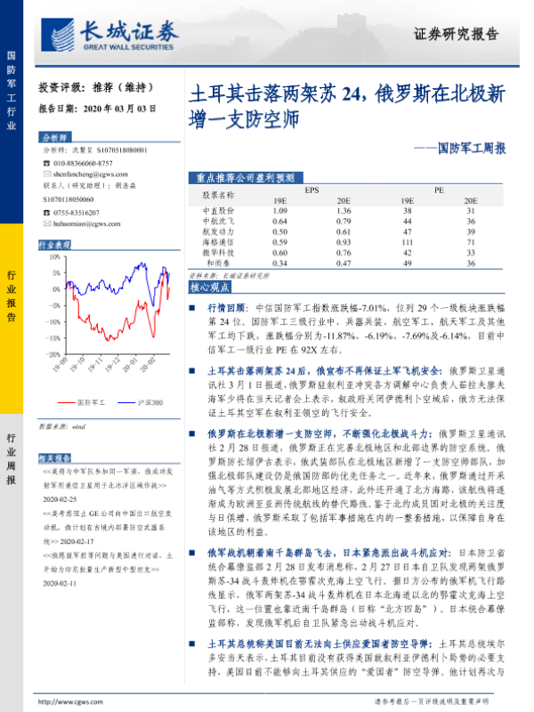 【长城证券】【20200303】20200303-长城证券-国防军工周报:土耳其击落两架苏24,俄罗斯在北极新增一支防空师-13页 行业研究