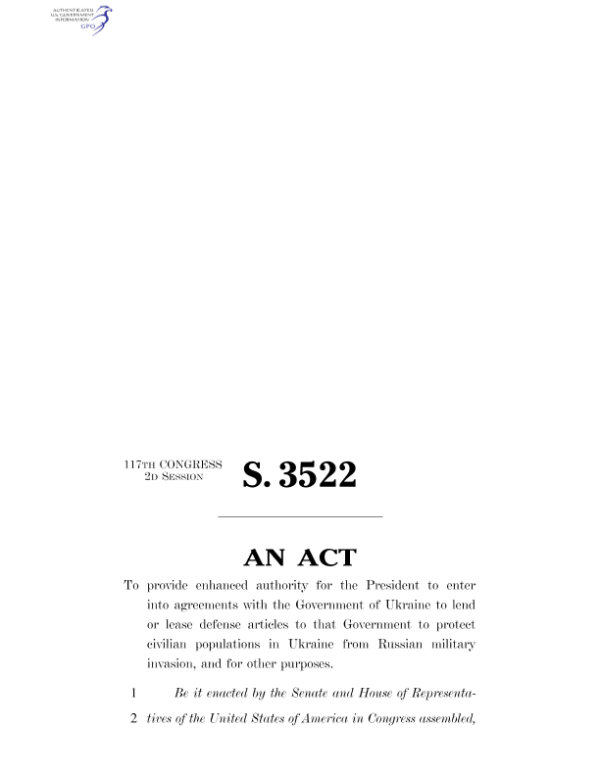 【United States Congress】【20220406】To provide enhanced authority for the President to enter into agreements with the Government of Ukraine to lend or lease defense articles-4页 政策文件