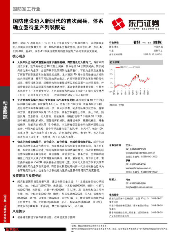 【东方证券】【20191007】国防军工行业:国防建设迈入新时代的首次阅兵,体系确立亟待量产列装跟进-3页 行业研究