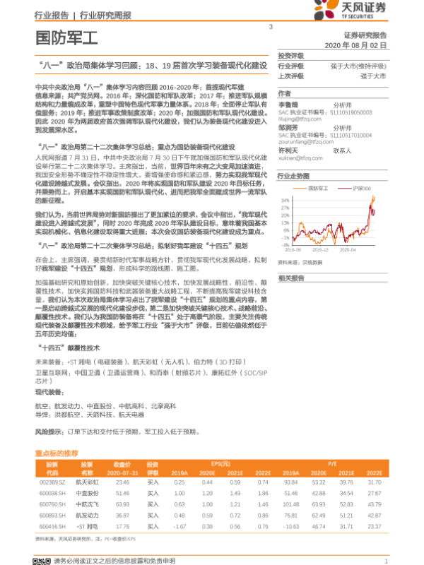 【天风证券】【20200802】国防军工行业研究周报:“八一”政治局集体学习回顾:18、19届首次学习装备现代化建设-2页 行业研究