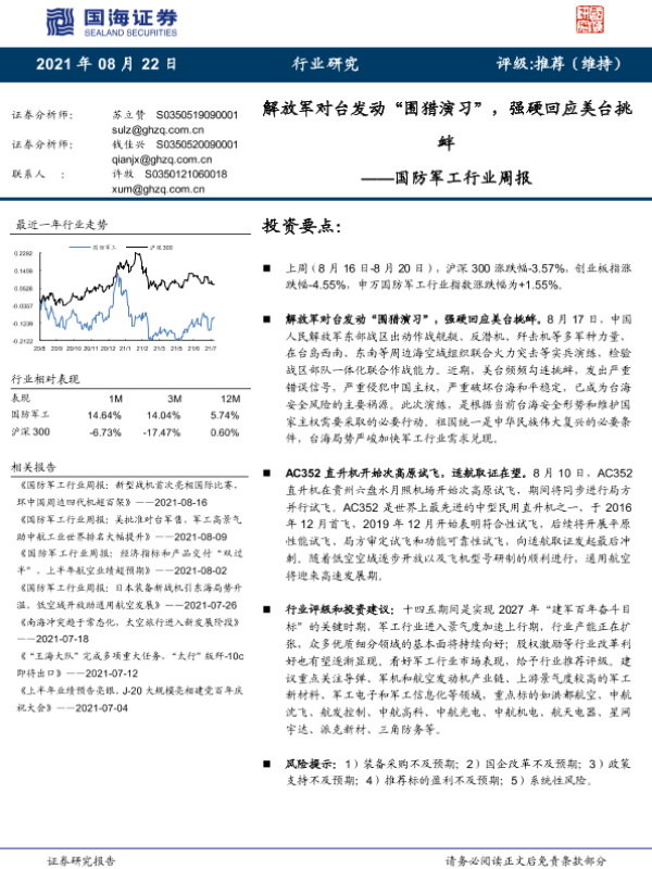 【国海证券】【20210822】国防军工行业周报:解放军对台发动“围猎演习”,强硬回应美台挑衅-10页 行业研究