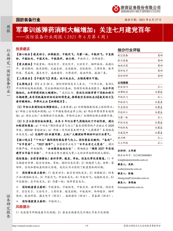 【浙商证券】【20210627】国防装备行业周报(2021年6月第4周):军事训练弹药消耗大幅增加;关注七月建党百年-9页 行业研究
