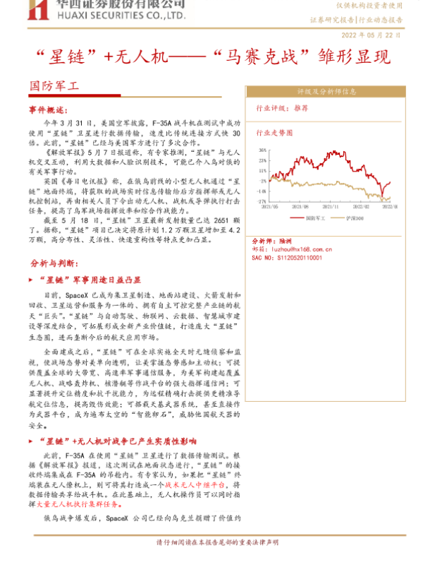 【华西证券】【20220522】国防军工:“星链”+无人机——“马赛克战”雏形显现-15页 行业研究