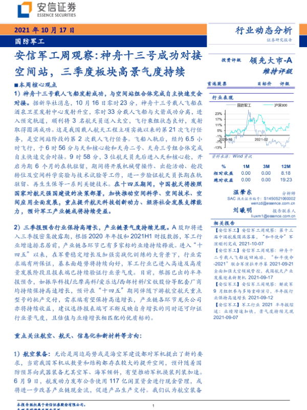 【安信证券】【20211017】安信军工周观察:神舟十三号成功对接空间站,三季度板块高景气度持续-12页 行业研究