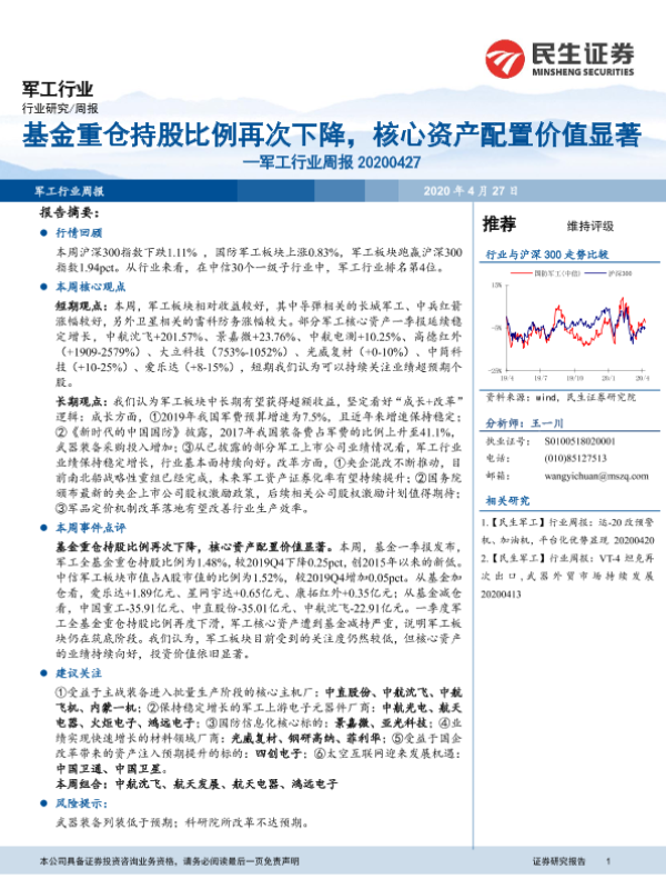 【民生证券】【20200427】20200427-民生证券-军工行业周报:基金重仓持股比例再次下降,核心资产配置价值显著-45页 行业研究