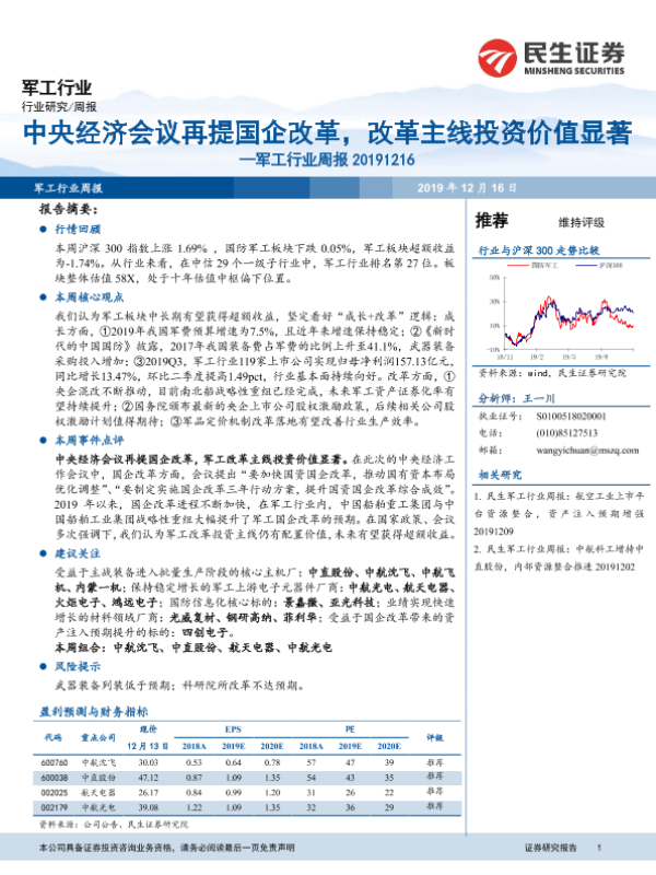 【民生证券】【20191216】20191216-民生证券-军工行业周报:中央经济会议再提国企改革,改革主线投资价值显著-27页 行业研究