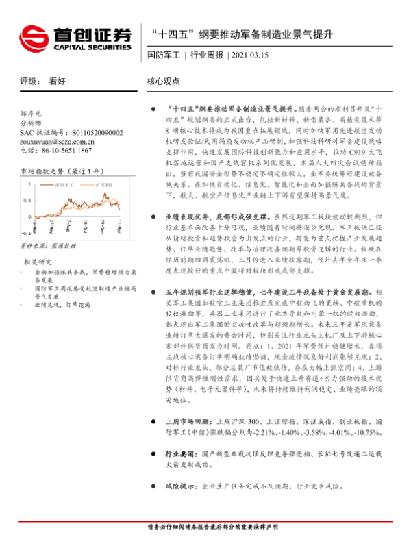 【首创证券】【20210315】20210315-首创证券-国防军工行业周报:“十四五”纲要推动军备制造业景气提升-9页 行业研究