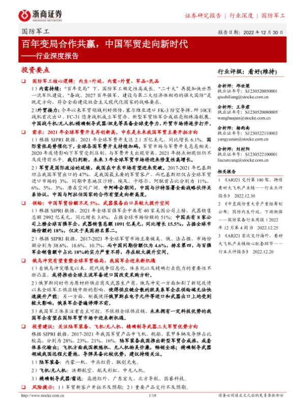 【浙商证券】【20221230】百年变局合作共赢,中国军贸走向新时代-18页 行业研究