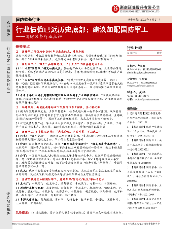 【浙商证券】【20220427】国防装备行业点评:行业估值已近历史底部;建议加配国防军工-5页 行业研究