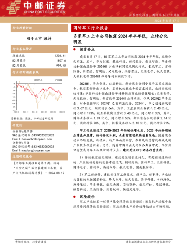 【中邮证券】【20240817】20240817-中邮证券-国防军工行业报告:多家军工上市公司披露2024年半年报,业绩分化明显-14页 行业研究