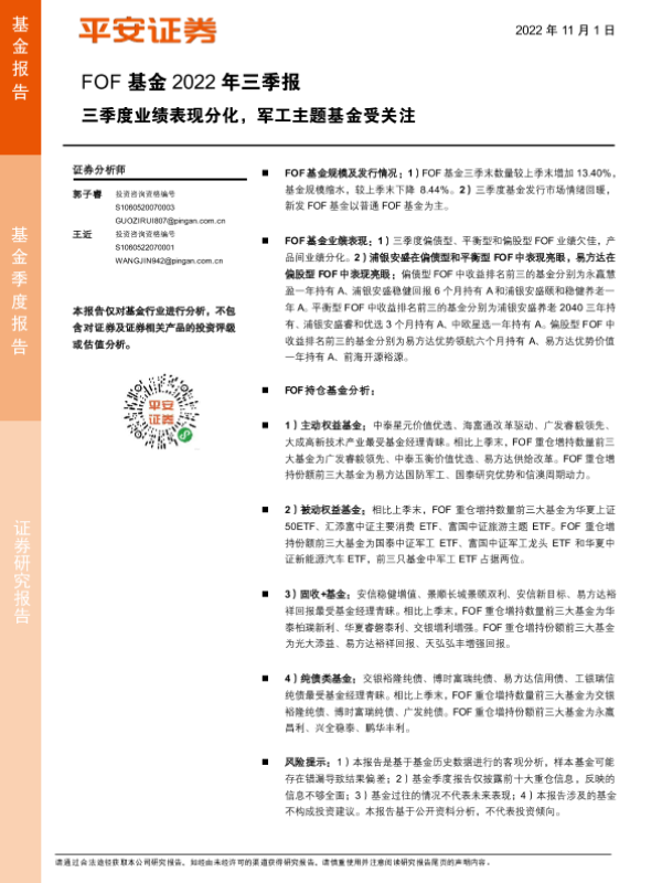 【平安证券】【20221101】FOF基金2022年三季报:三季度业绩表现分化,军工主题基金受关注-16页 行业研究