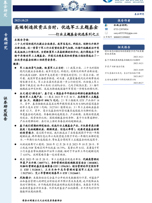 【国泰君安证券】【20231025】行业主题基金优选系列之三:高端制造投资正当时,优选军工主题基金-19页 行业研究