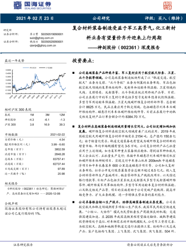 【国海证券】【20210223】神剑股份(002361)深度报告:复合材料装备制造受益于军工高景气,化工新材料业务有望量价齐升迎来上行周期-39页 行业研究
