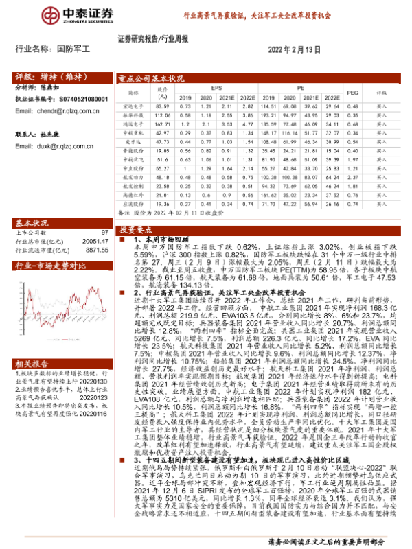 【中泰证券】【20220213】20220213-中泰证券-国防军工行业周报:行业高景气再获验证,关注军工央企改革投资机会-19页 行业研究