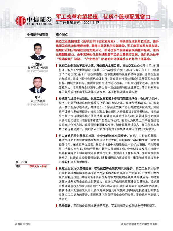 【中信证券】【20210117】军工改革有望提速,优质个股现配置窗口-3页 行业研究