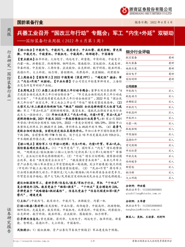 【浙商证券】【20220604】国防装备行业周报(2022年6月第1周):兵器工业召开“国改三年行动”专题会;军工“内生+外延”双驱动-8页 行业研究