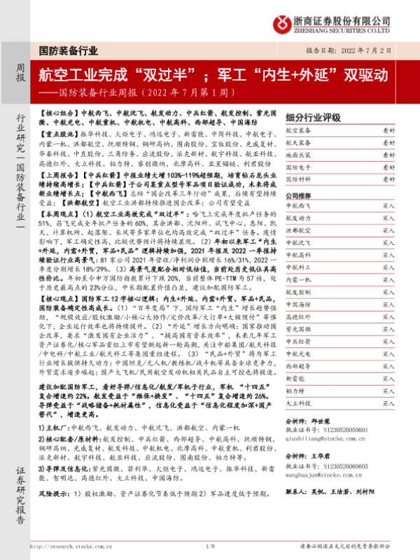 【浙商证券】【20220702】国防装备行业周报(2022年7月第1周):航空工业完成“双过半”;军工“内生+外延”双驱动-9页 行业研究