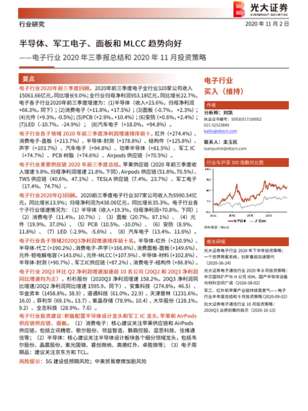 【光大证券】【20201102】电子行业2020年三季报总结和2020年11月投资策略:半导体、军工电子、面板和MLCC趋势向好-31页 行业研究