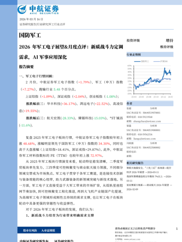 【中航证券】【202603】2026年军工电子展望&月度点评:新质战斗力定调需求,AI军事应用深化-16页 证券期货研究报告