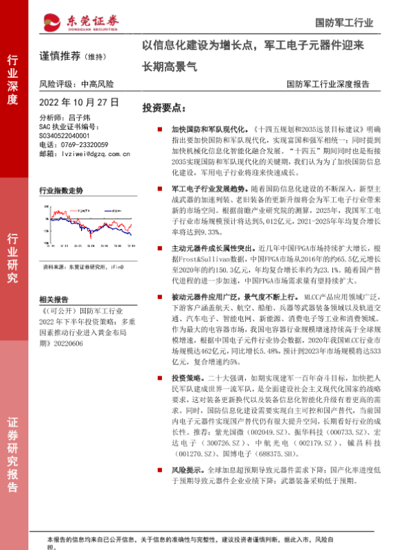 【东莞证券】【20221027】国防军工行业深度报告:以信息化建设为增长点,军工电子元器件迎来长期高景气-19页 行业研究
