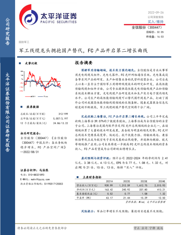 【太平洋证券】【20220926】军工线缆龙头拥抱国产替代,FC产品开启第二增长曲线-23页 行业研究