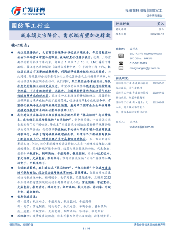 【广发证券】【20220717】20220717-广发证券-国防军工行业投资策略周报:成本端大宗降价、需求端有望加速释放-16页 行业研究