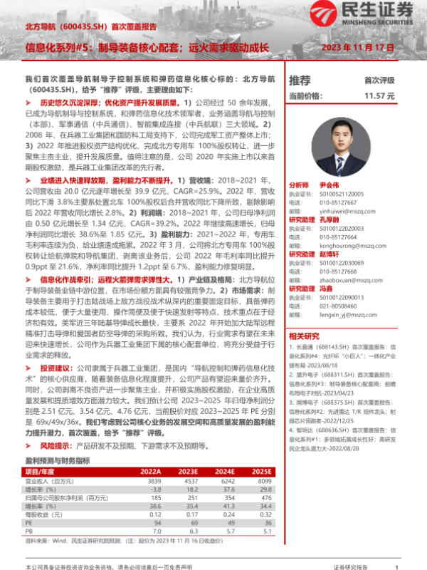 【民生证券】【20231117】北方导航-600435.SH-首次覆盖报告:信息化系列#5:制导装备核心配套;远火需求驱动成长-25页 行业研究