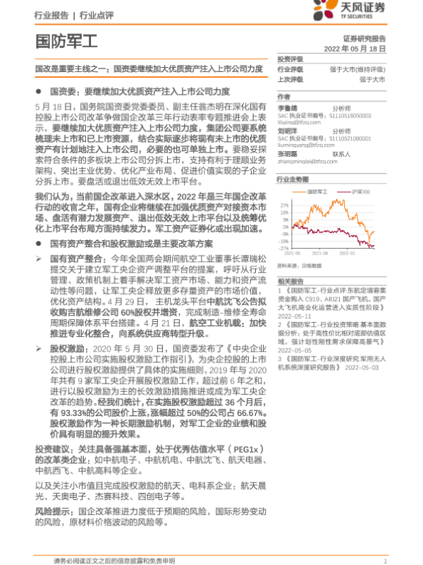 【天风证券】【20220518】国防军工国改是重要主线之一:国资委继续加大优质资产注入上市公司力度-2页 行业研究