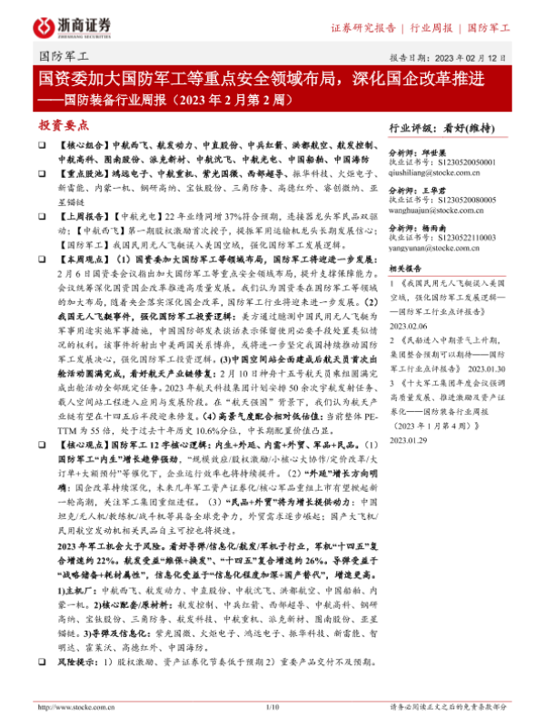 【浙商证券】【20230212】国防装备行业周报(2023年2月第2周):国资委加大国防军工等重点安全领域布局,深化国企改革推进-10页 行业研究