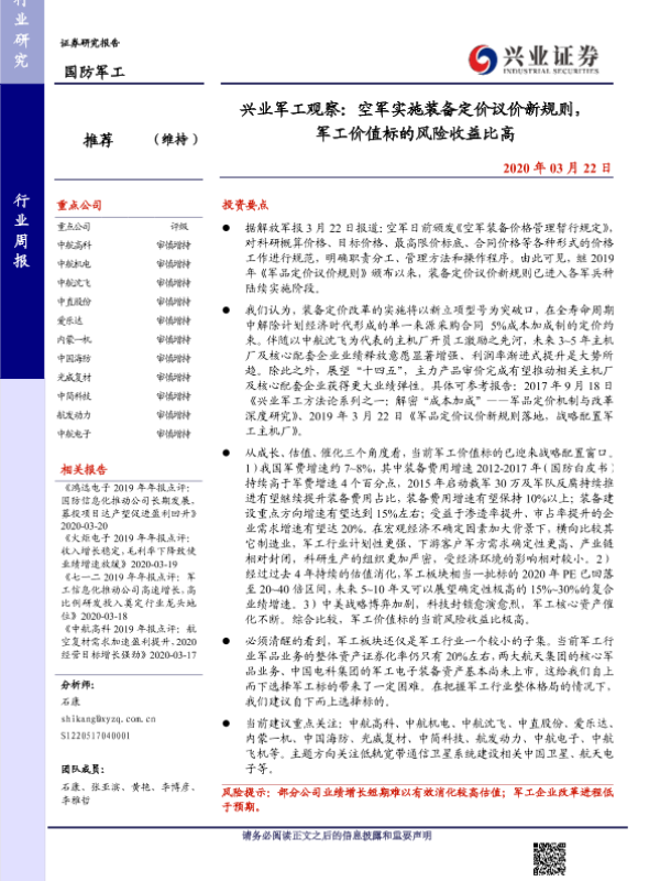 【兴业证券】【20200322】兴业军工观察:空军实施装备定价议价新规则,军工价值标的风险收益比高-15页 行业研究