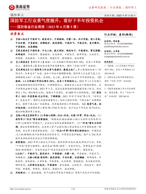 【浙商证券】【20230702】国防装备行业周报(2023年6月第5周):国防军工行业景气度提升,看好下半年投资机会-10页 行业研究